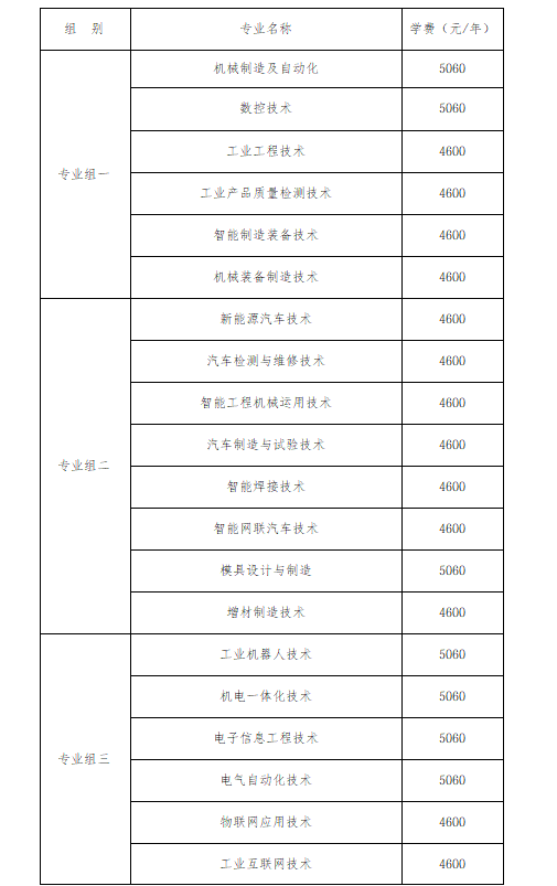 专业组二聚焦汽车及相关制制类专业,涵盖新能源汽车手艺、汽车检测取维修手艺等8个专业,此中模具设想取制制膏火为5060元/年,其余7个专业膏火均为4600元/年,包含当下抢手的新能源汽车、智能网联汽车相关专业,就业前景广漠。专业组三以电气取从动化类专业为从,包含工业机械人手艺、机电一体化手艺、电子消息工程手艺、电气从动化手艺、物联网使用手艺、工业互联网手艺6个专业,前4个专业膏火为5060元/年,物联网使用手艺、工业互联网手艺膏火为4600元/年,契合智能化财产成长趋向。专业组四为消息手艺类专业,包含计较机收集手艺、挪动使用开辟、软件手艺、大数据手艺、云计较手艺使用5个专业,软件手艺膏火为7800元/年,其余3个专业膏火为4600元/年,适配数字经济成长需求。