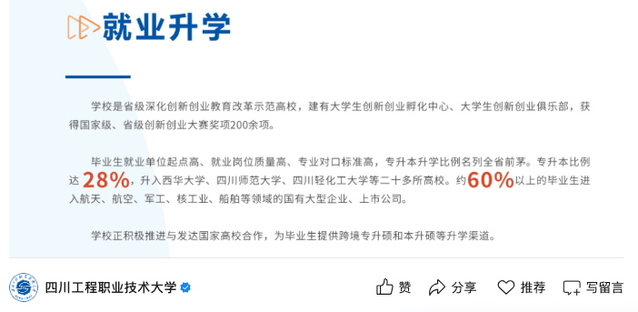而正在我国,只需是具有部下布景的高校,绝大大都就业前景都不会太差,即即是职业手艺大学,也不破例。学校最新发布的就业数据显示,结业生有60%以上都能进入航空航天、军工、核工业、船舶等范畴的国有大型企业和上市公司就业!